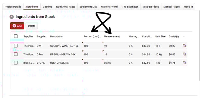 Once you've added each ingredient, we have to set the Portion (Unit) and Measurement (i.e. how much of each ingredient is used in the recipe).