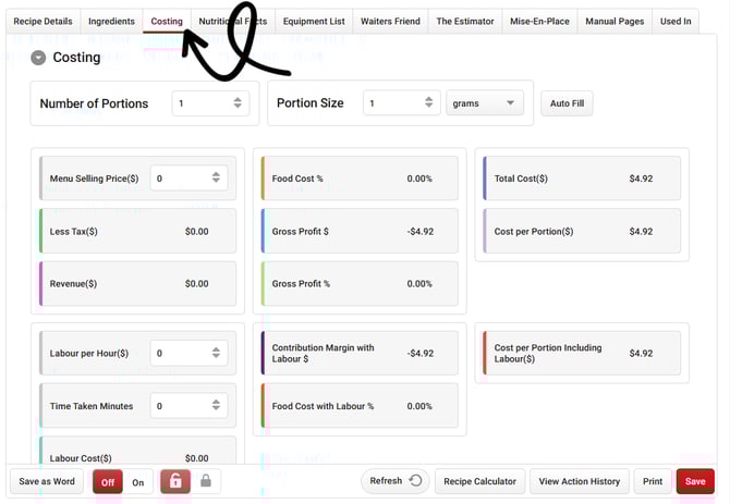 Once our Ingredients have been added to the Recipe, move on to the Costing tab: