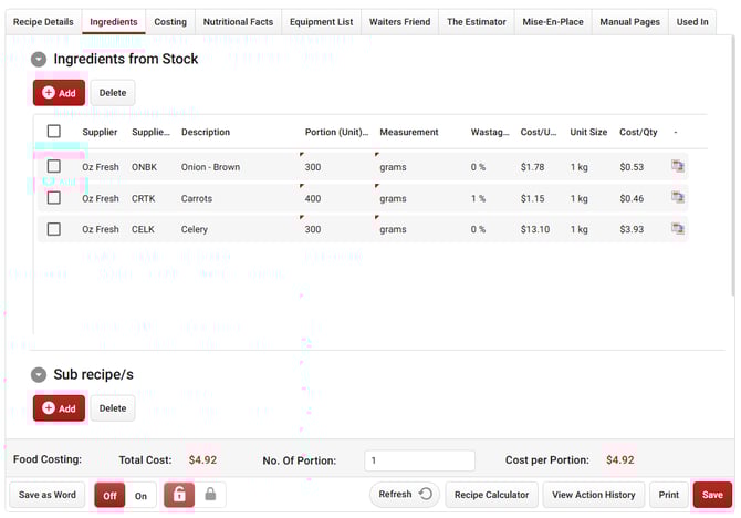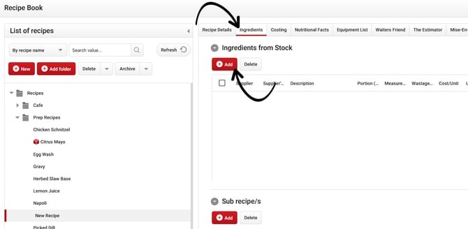 Now that the basic details of the recipe is complete, we can move on to adding the Ingredients that make up the dish. This involves selecting stock items from your database and noting the amount that should be used.
