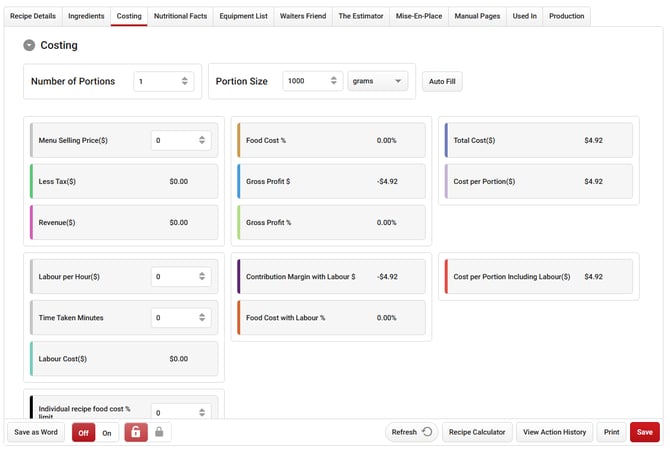 The system is now able to determine your total Cost Per Portion, Food Cost, Gross Profit, and more! You can refine costing further by entering any applicable Labour costs and time spent to more accurately determine the real cost of preparing your Recipe.