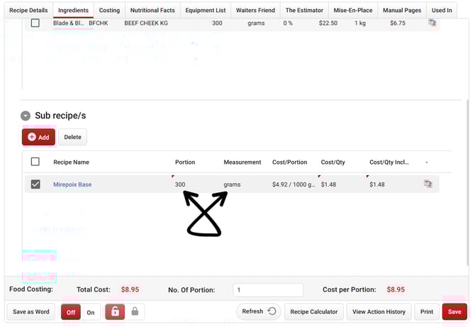 Now we need to set the Portion and Measurement for this recipe. This recipe calls for 300 grams of the Mirepoix Base: