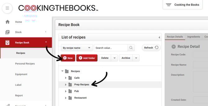 Select the Prep Recipes folder, and then click New. This is going to create the recipe directly within this folder.