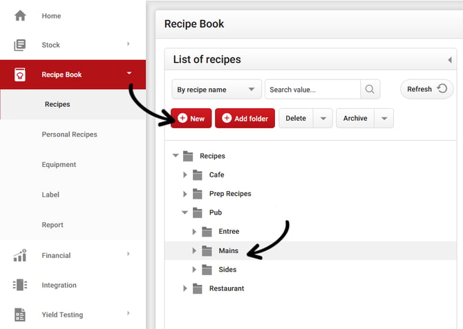 While in the Mains folder, click New to create a new recipe.