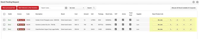 Allows you to link a new item to an existing product. Once linked, any invoices that contain the same details for that item will be automatically associated with the linked stock item instead. For items without a Supplier Code to match against, please confirm the received item is the same as an existing product before linking items. |
