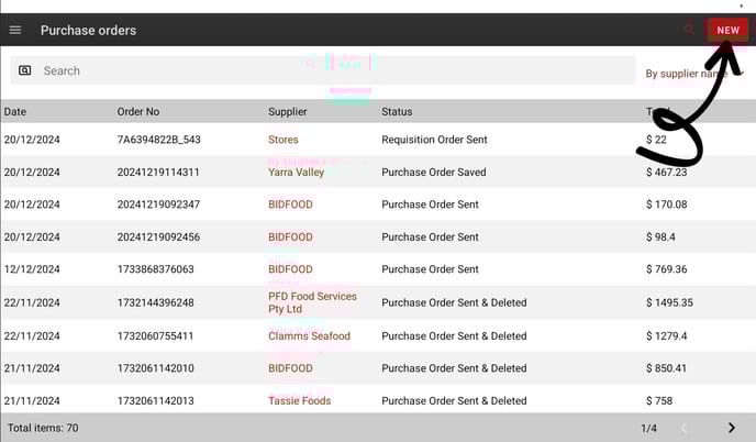 Just like when creating a new Purchase Order, tap the NEW button in the top right corner: