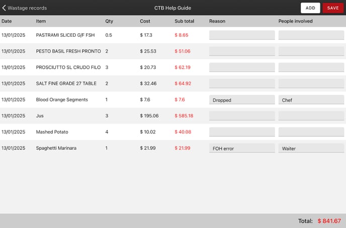 Once complete, tap the SAVE button in the top right corner. You will then be taken back to the Wastage Records page: